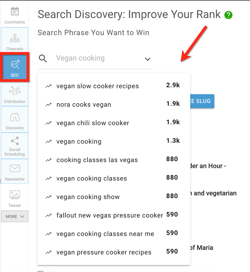It can be tricky to nail down which search phrase you want to win. Within RebelMouse's SEO tab, you can brainstorm your ideas in real time. Through the creative usage of APIs, we ensure writers and editors are armed with the right information when optimizing content for SEO. In the example above, the drop-down list is suggesting search phrases that are already performing well on Google. The number next to each recommended phrase is its monthly search volume.